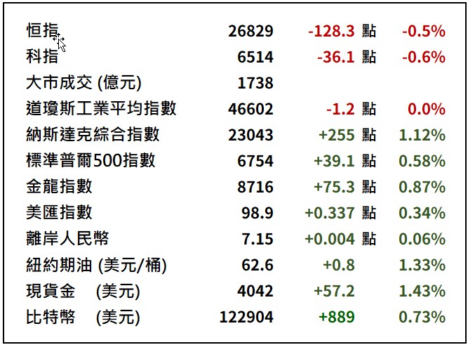 美國聯儲局公布9月議息會議紀錄,投資者憧憬聯儲局減息及企業盈利保持強韌,標普500指數與納斯達克指數即市及收市同創歷史新高,納指收升1.1%,標指升0.6%,道指則微跌1點。