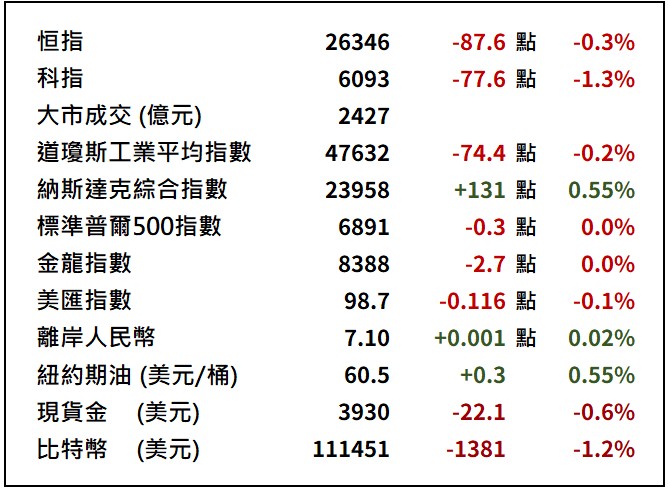 港股在上一個交易日收報26346點,跌87點或0.3%。科指跌77點或1.26%,全日成交略減至2429億。科技股領跌,阿里巴巴(9988.HK)跌1.5%,騰訊(700.HK)跌1.6%。金礦股受金價下跌拖累,紫金礦業(2899.HK)跌5.6%,為最大跌幅藍籌,招金礦業(1818.HK)跌4%。滙豐控股(5.HK)逆市升4.4%,成最大升幅藍籌股。