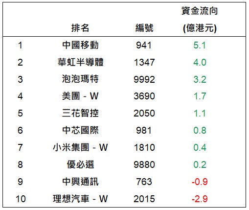 港股通上一交易日十大成交個股資金流排名