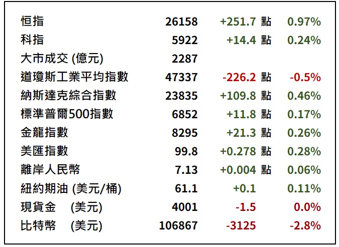 港股昨日全日向好。恒指早段高開93點後升幅擴大,全日升252點或0.97%,收報26034點,成交額達2288億元。友邦(1299.HK)業績理想,刺激股價大升5.9%,成為升幅最大藍籌。石油及煤炭股造好,中海油(883.HK)升3.5%,中石油(857.HK)升3.3%,中石化(386.HK)升1.9%,中國神華(1088.HK)升2.4%。半導體板塊則回吐,中芯國際(981.HK)跌2.8%,華虹半導體(1347.HK)跌3.5%。金價回落,加上中國黃金增值稅新規正式生效,金礦股及金飾股受壓。紫金礦業(2899.HK)跌1.6%。老鋪黃金(6181.HK)日跌7.1%,周大福(1929.HK)跌8.6%,為表現最差藍籌。