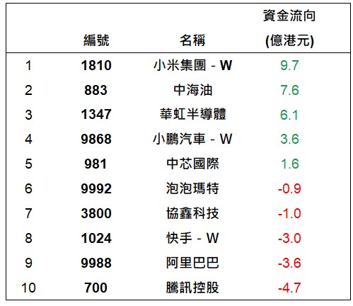 港股通上一交易日十大成交個股資金流排名