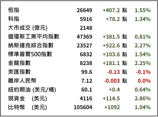 【市前速遞】美股受撥款法案突破帶動 三大指數大幅反彈2025年11月11日美國參議院就聯邦政府臨時撥款法案出現突破性進展,市場憧憬美國史上最長的政府停擺有望告終,帶動全球股市反彈。美股三大指數周一全線造好,道指曾升超過400點,納指更急漲逾2%。最終道指收報47369點,升381點或0.8%;標普500指數升1.5%,報6832點;納指漲2.2%,報23527點。金龍指數升2.2%,現貨金價一度抽高2.9%,至每盎斯4115.92美元。