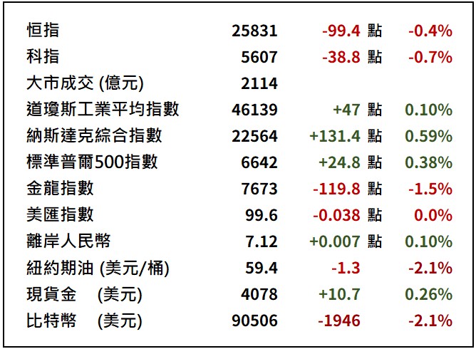 港股昨日高開24點,早段曾升115點,但午後沽壓再現,大市轉跌,最終恒指收報25831點,跌99點;科指跌0.6%,成交2116億元。個別股份表現分化,小米(1810.HK)績後股價回軟,全日跌4.8%,為表現最弱藍籌;創科(669.HK)跌2.8%,為次差表現藍籌。能源及內需股表現支持大市,中石化(386.HK)升2.9%,中石油(857.HK)升2.1%,中海油(883.HK)升1.2%。