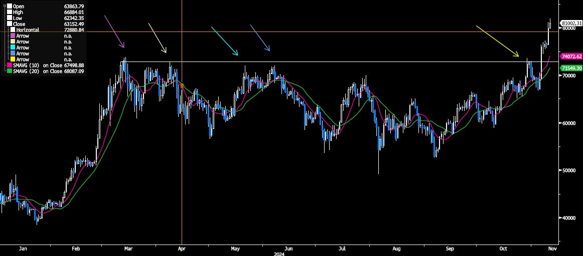 特朗普當選、比特幣突破8萬美元關口