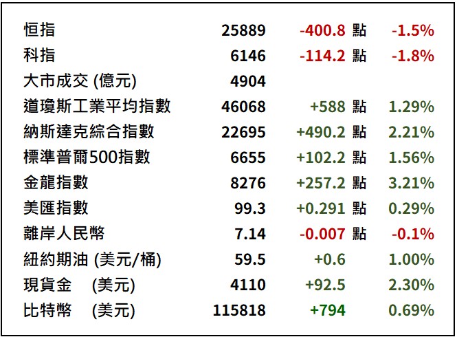 【市前速遞】美股港股雙雙反彈 金價再破頂2025年10月14日美股周一顯著回升,受惠於美國總統特朗普釋出貿易戰降溫信號,稱白宮對中美進一步磋商持開放態度。道指高開218點後漲幅逐步擴大,曾升至最多673點,高見46153點,收市仍升587點或1.3%,報46068點,收復上周五約七成失地。標指收漲1.6%,報6655點;納指急彈2.2%,報22695點。費城半導體指數勁升4.9%,金龍指數反映中概股表現回升3.2%。