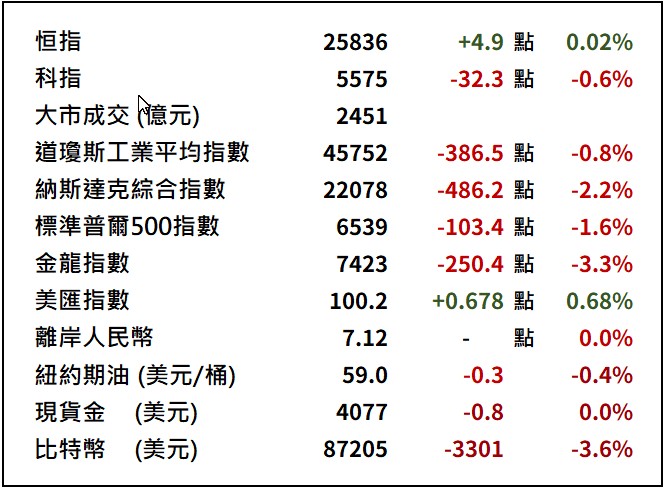 美國股市在英偉達(NVDA.US)公布理想業績並上調前景指引下,帶動道瓊斯指數曾一度飆升717點,標指和納指亦分別一度大漲近2%,顯示投資者對科技及人工智能概念充滿期望。然而,三大指數午後出現急速回落,並在接近全日最低位收市,道指跌386點或0.8%,標指跌1.5%,納指急挫2.1%。反映中概股表現的金龍指數大跌3.2%。歐洲三大股市則全線上揚,德國、法國及英國股指分別錄得0.5%、0.3%及0.2%的升幅。