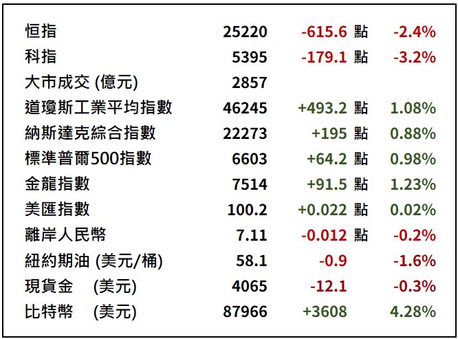 上周五美國股市在紐約聯儲銀行總裁威廉斯公開表示聯儲局短期內仍有減息空間後強力反彈,道瓊斯指數高開後進一步擴大升幅,最多曾反彈825點,最終收市升493點或1%,報46245點;標準普爾500指數收報6602點,升0.9%;納指收市報22273點,升0.8%。波動指數VIX於周五大幅回吐14.7%至23.4,市場避險情緒下降。