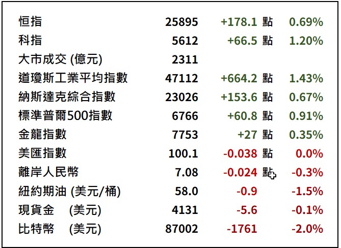 美股隔晚延續此前兩日的強勁反彈勢頭,道指周二在高開後一度短暫回落,其後在零售及部分防守型板塊帶動下拾級而上,最多升約734點,收市仍漲664點,報47112點,為連升第三個交易日。標普500指數一度跌0.6%,最終倒升0.9%;納指早段在人工智能晶片股受壓下曾跌1.2%,收市反覆轉升0.6%。