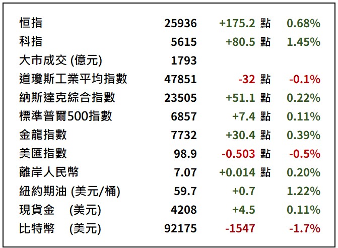 商品及加密資產方面,比特幣曾回吐約3%以上,跌至約9.1萬美元附近。現貨金價最多回落約0.6%,低見每盎司約4175美元。紐約期油收市上升約1.2%至每桶約59.7美元,布蘭特期油則升近1%至約63.3美元。
