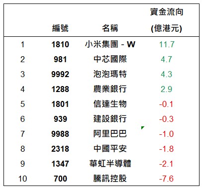 港股通上一交易日十大成交個股資金流排名