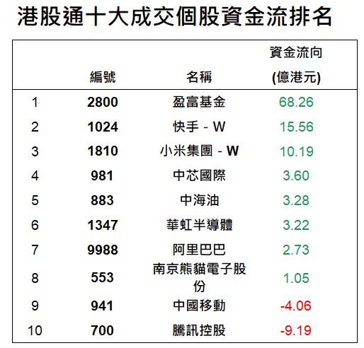 港股通上一交易日十大成交個股資金流排名