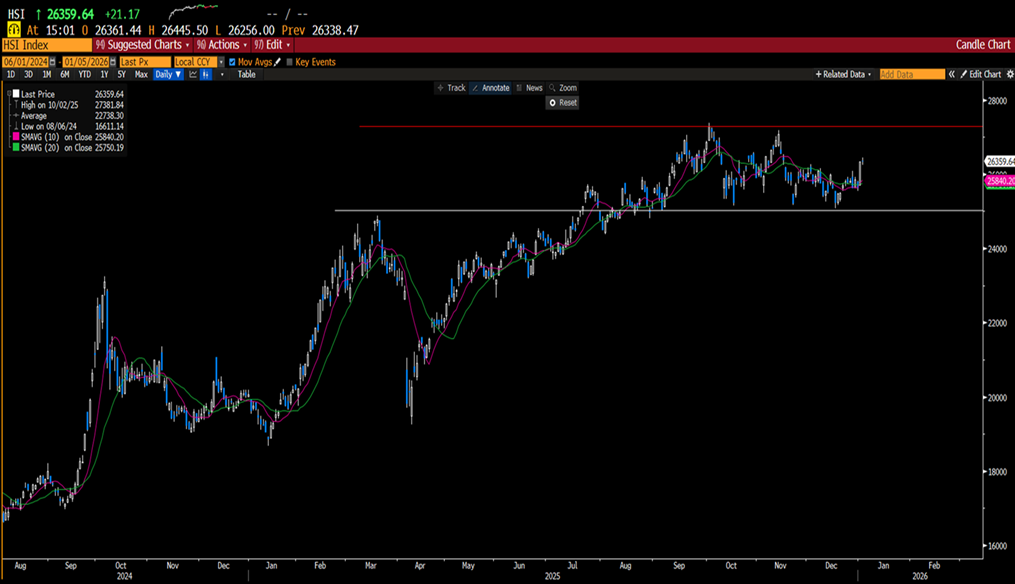 2025年恒生指數從年初低位反彈,全年升幅接近28%。上半年受特朗普關稅政策影響一度急跌,然而下半年受惠人工智能以及弱勢美元和減息政策,恒指基本上收復全部失地。受中央經濟刺激措施逐步見到成效,加上企業盈利修復及估值重估驅動。恒生科技指數表現尤為突出,帶動整體指數上行。進入2026年,我們預期指數走勢將由2025年的「報復式反彈」轉為「穩健增長」階段。恒指現時的市盈率只有12.5倍,較區內的股市如日本22.5倍、韓國18.7倍、台灣24倍、滬深300指數18倍為低,若恒指的市盈率追平區內股市的話,恒指目標將遠高於30000點,然而港股正處於國際政治關係風眼中心,我們加上風險溢價,恒指2026目標預估可望挑戰30000點水平。
