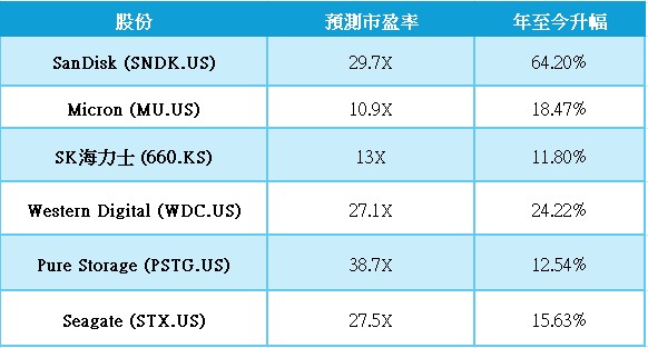快閃記憶體(NAND Flash)與固態硬碟(SSD):如SanDisk(SNDK.US),曾為NAND Flash領導廠商,近期重新獨立或分拆後表現突出、Micron(MU.US)、Western Digital (WDC.US)的部分業務。