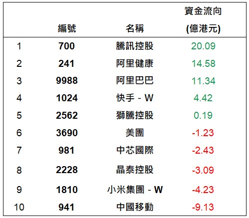 科網股普遍強勢,阿里巴巴(9988.HK) 升5.7%、標普予快手(1024.HK) 擬發行的高級無抵押票據評級為「A-」,評級展望穩定,股價升4.4%、百度(9888.HK) 升1.9%、騰訊(700.HK)升0.8% 。惟美團(3690.HK) 及京東集團(9618.HK) 逆市向下,分別跌3.2%及1.2%。攜程(9961.HK) 逆市跌逾6.5%,為表現最差藍籌。中資金融股、公用股及地產股也有沽壓,平保(2318.HK) 及電能(6.HK)均跌逾1%。