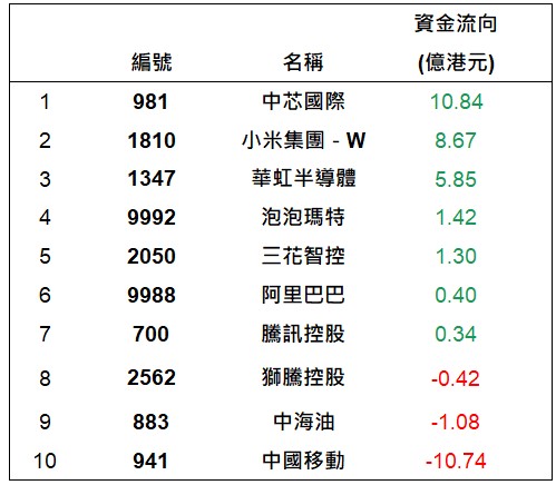 港股通上一交易日十大成交個股資金流排名