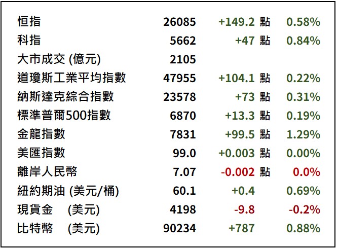 美股在消費信心回升、經濟數據穩健,以及市場憧憬聯儲局下周減息的帶動下,上周五美股三大指數上周五普遍向好,道指曾一度升282點,最終收報約47954點,全日升104點;標指最多升0.5%至約6895點,距離歷史高位僅約0.3%,收市仍升0.1%,連升第四日;納指則上揚0.3%。 反映中概股的金龍中國指數上升1.2%,一周計,道指累升約0.5%,標指升約0.3%,納指累升約0.9%,金龍中國指數則反彈約0.5%。