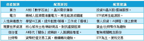 我們未來的主要投資可集中在以下相關的AI基礎設施與稀缺資源。目標資產分配:算力30%、電力20%、資源20%、比特幣/黃金15%、軟技能/信任15%。這不僅對抗貶值,還強化現金流。