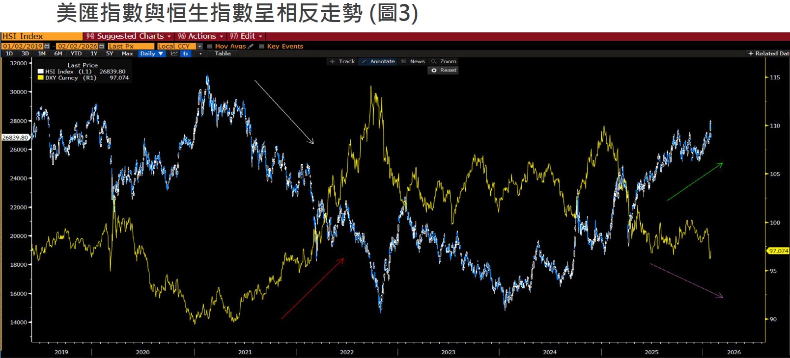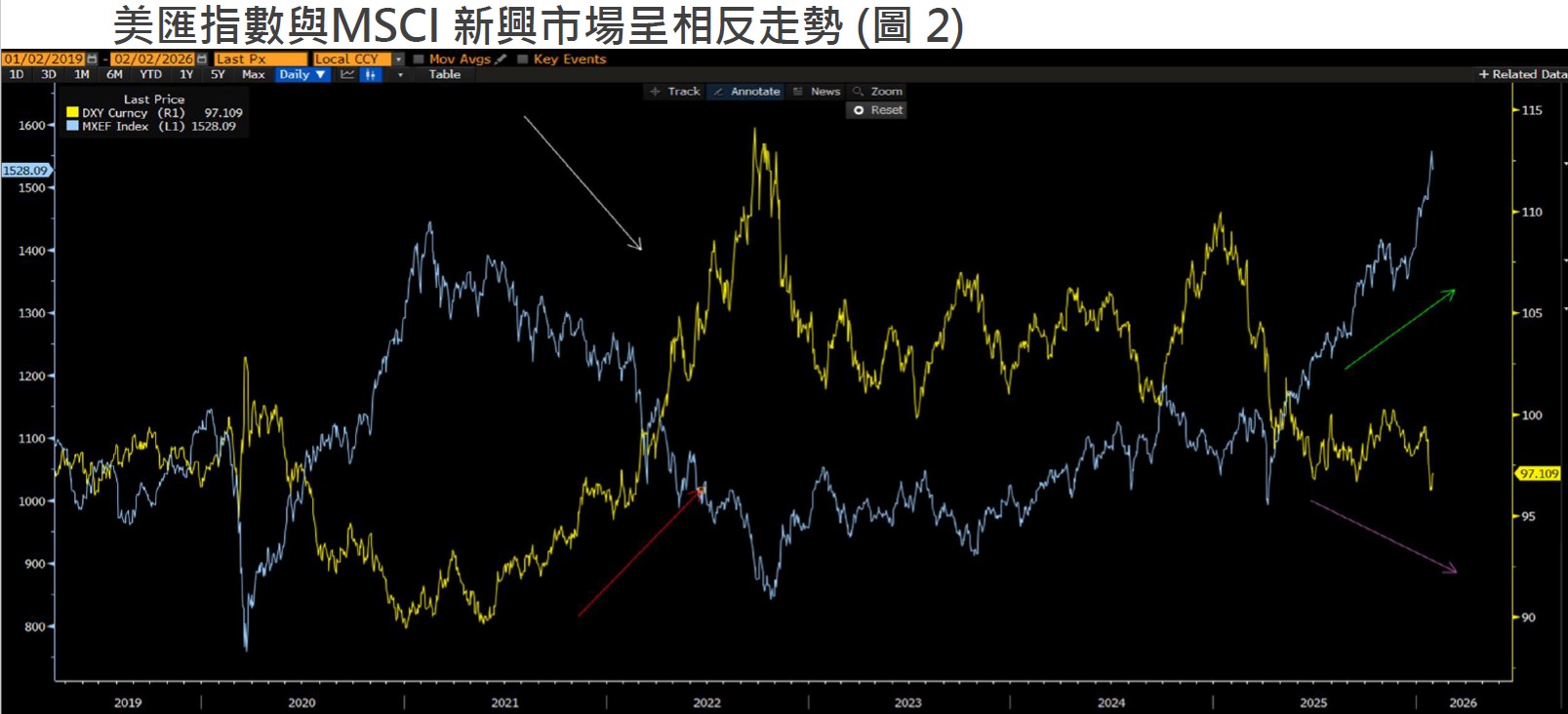 • 根據過往經驗,美匯指數和新興市場指數呈相反方向,若美匯持續轉弱,料有利新興市場股市發展。