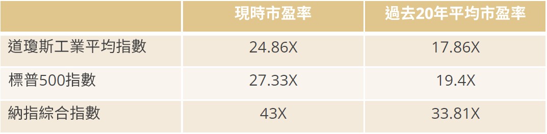 • 以估值而言,三項主要指數估值明顯高於過去20年平均,加上踏入四年一次的下跌年份,投資者宜對美股抱有一定戒心。