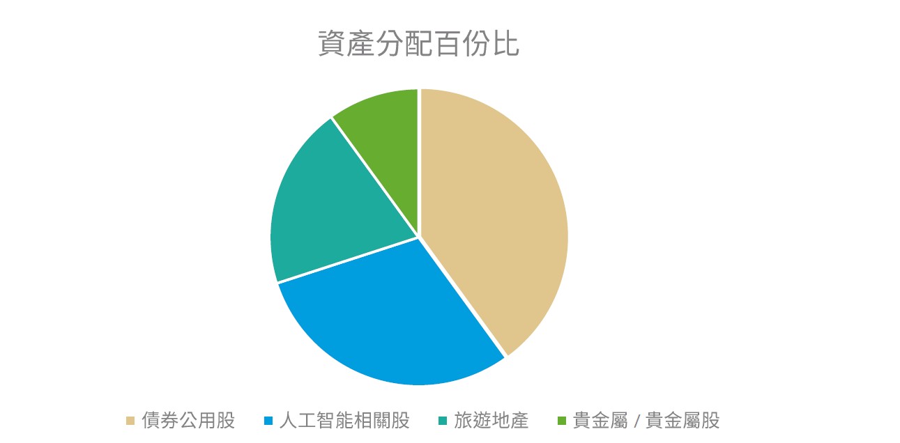 • 由於不確定性的因素仍然存在,我們建議投資者及早做好資產配置安排以分散風險。我們建議投資者可投入40%資金至債券及公用類股份以賺取穩定現金流回報,30%投入至人工智能機械人等領域,20%投入至內需及受惠人民幣升值等資產,10%投入至高風險高回報的貴金屬和其相關股份。